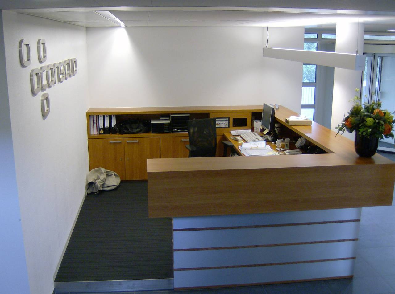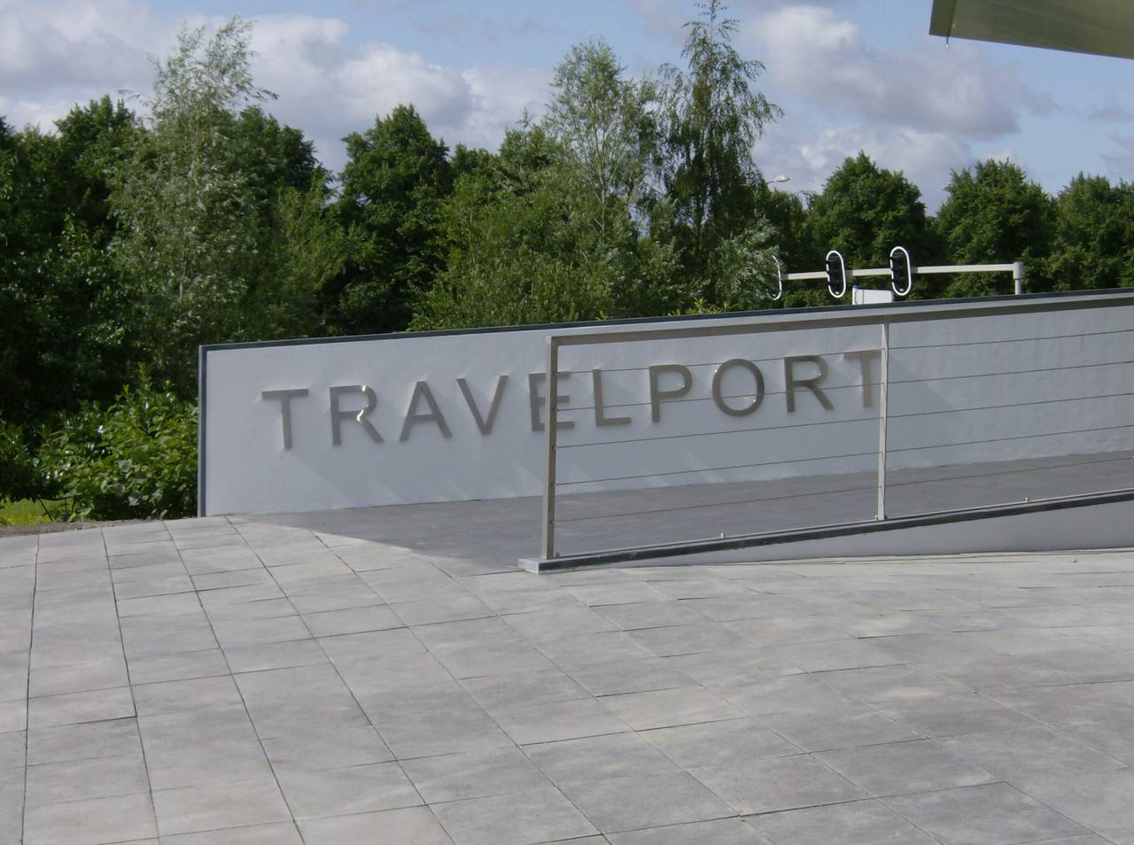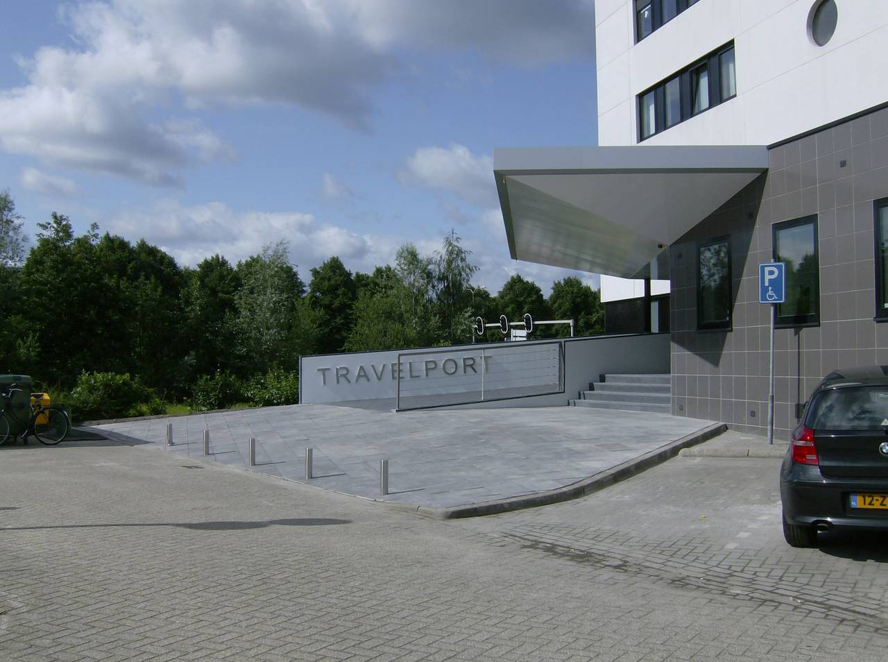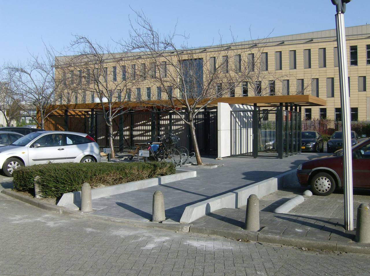 The office Building ' Travelport' at the Radarweg in Amsterdamis is renovated in a number of phases. We made the design for the entrance hall. The entrance at the back side has got a new facade with a new tour lock. The ramp is provided with an airy fencing. Because of this fence the new signing becomes visible. For the site we have designed a new bicycle shed with a smoking area.