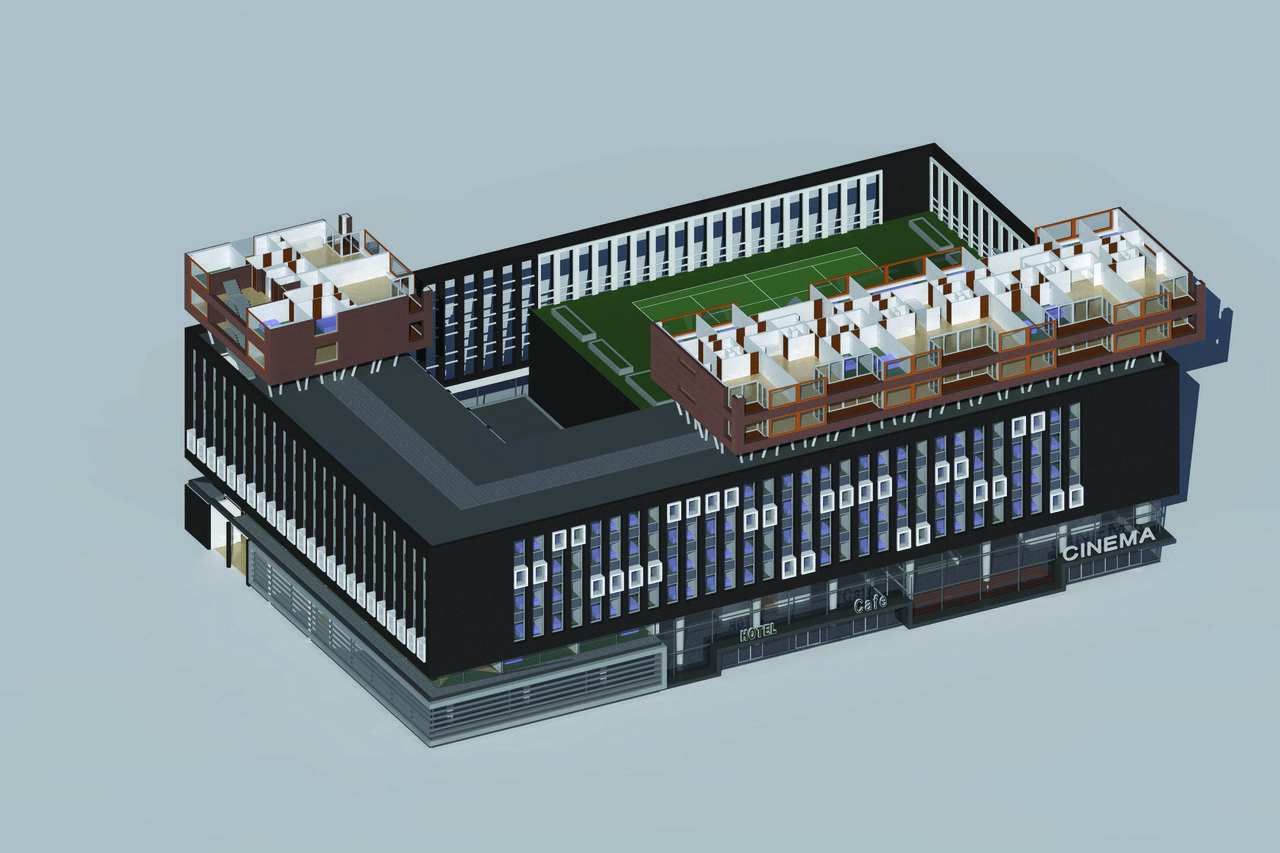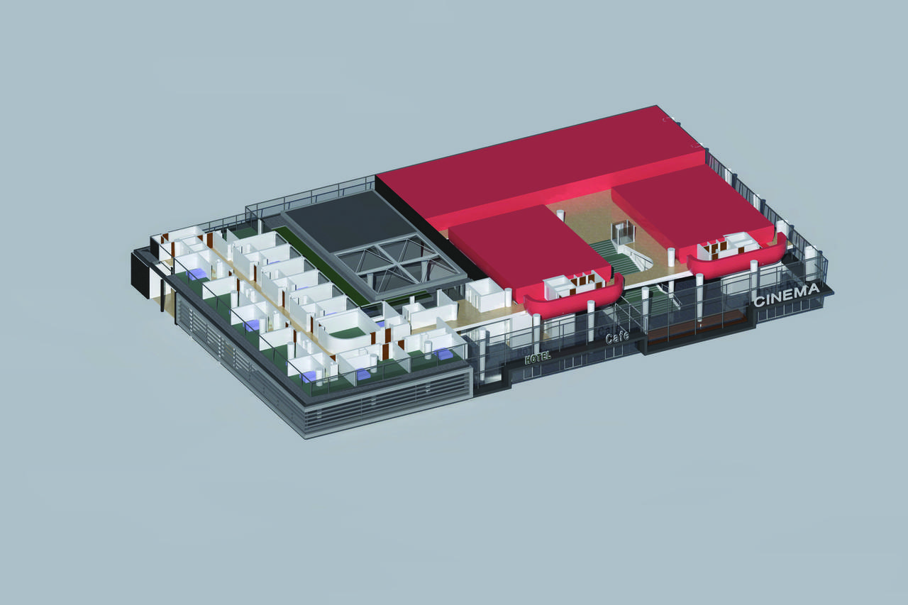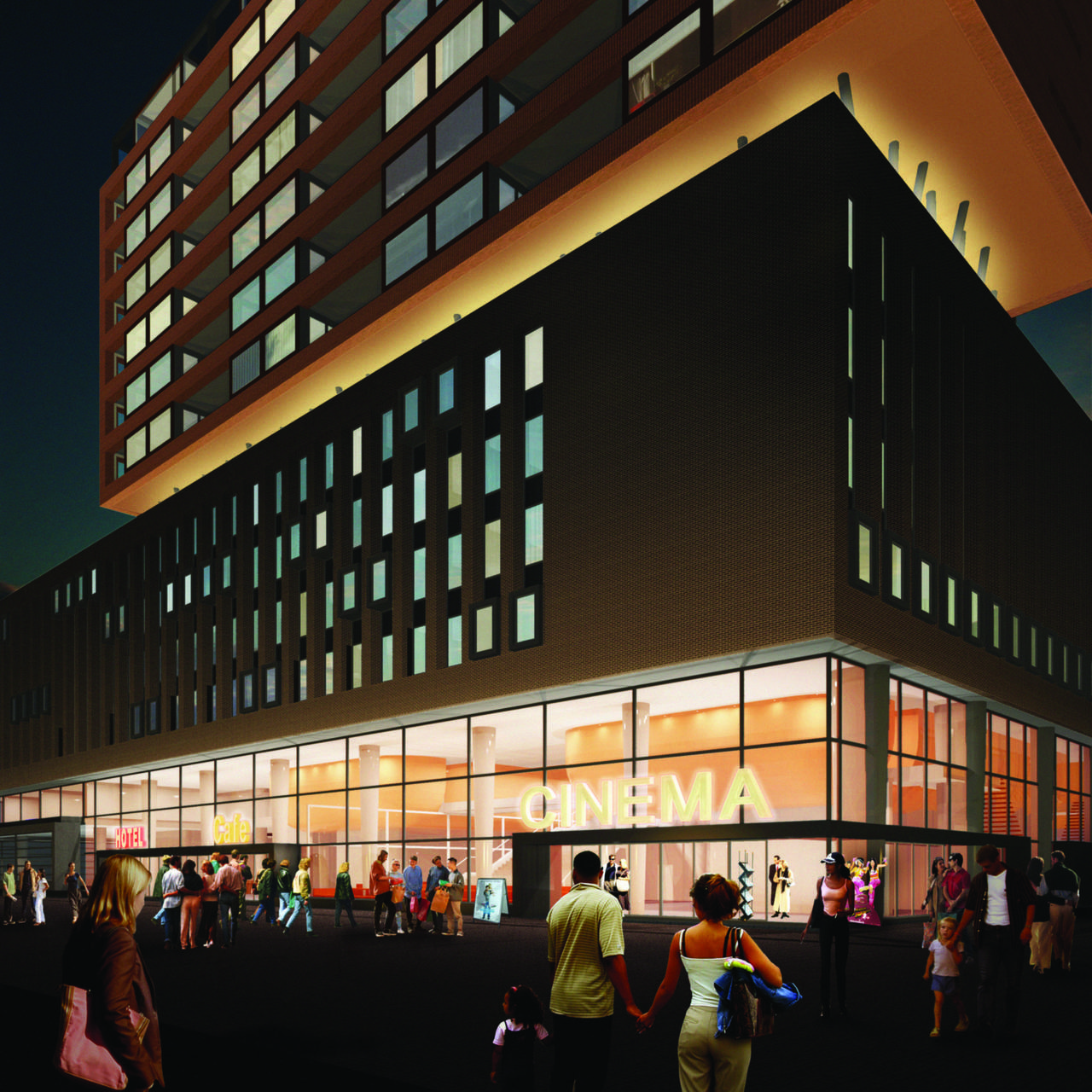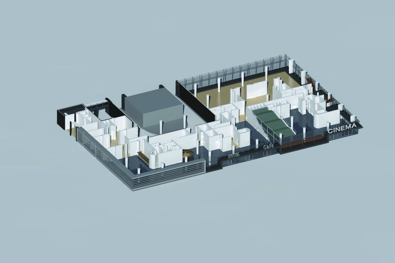 We designed ‘Nightporter’ in a contest for a location in Amstelveen. ‘Nightporter’ is a building in which the functions of hotel, cinema and apartments are accommodated. In the plinth, the accesses to the various functions are included. The glass base serves as a large shop window. The bottom of the cinemas are visible from here. In the lifted volume we find the hotel rooms. The apartments are located on a third layer of the plan. They have a view over the nearby square.
